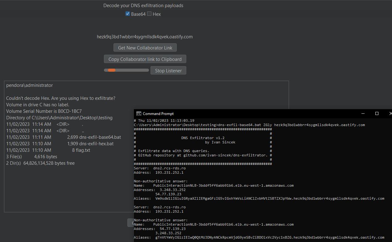 You can switch back and forth between Base64 and Hex while using the same Burp Collaborator link and it even supports receiving and decoding multiple lines. If like me, you forget to switch between encodings, it fails the decoding and reminds you to check.